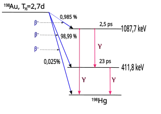 Ici à gauche, on voit un schéma un peu plus complexe : la désintégration de l'isotope 198Au qui peut être produit en irradiant de l'or dans un réacteur nucléaire. 198Au se désintègre par désintégration bêta vers un de deux états excités ou vers l'état fondamental de l'isotope 198Hg du mercure. Dans la figure, le mercure est à la droite de l'or, parce que le nombre de protons de l'or est 79, et celui du mercure est 80. Les états excités retombent très rapidement (en 2,5 et 23 picosecondes, respectivement) vers l'état fondamental.