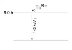 En général, les états excités des noyaux ont une vie moyenne très brève, et se désexcitent presque instantanément après une désintégration bêta par transition gamma (voir ci-dessus). En revanche, l'état excité de l'isotope de technétium montré ici à droite a une demi-vie assez longue. C'est pourquoi on l'appelle "métastable" (indiqué par le "m" de 99mTc). Il retombe à l'état fondamental par transition (ou désexcitation) gamma avec une demi-vie de 6 heures.