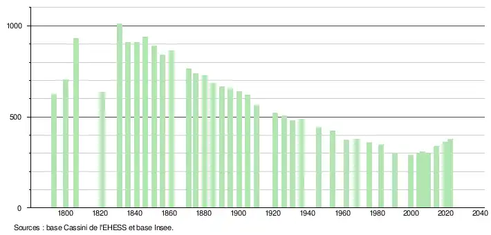 L'évolution du nombre d'habitants est connue à travers les recensements de la population effectués dans la commune depuis 1793. Pour les communes de moins de 10 000 habitants, une enquête de recensement portant sur toute la population est réalisée tous les cinq ans, les populations de référence des années intermédiaires étant quant à elles estimées par interpolation ou extrapolation[14]. Pour la commune, le premier recensement exhaustif entrant dans le cadre du nouveau dispositif a été réalisé en 2004[15].
