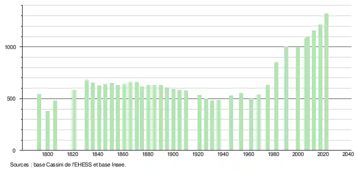 L'évolution du nombre d'habitants est connue à travers les recensements de la population effectués dans la commune depuis 1793. Pour les communes de moins de 10 000 habitants, une enquête de recensement portant sur toute la population est réalisée tous les cinq ans, les populations de référence des années intermédiaires étant quant à elles estimées par interpolation ou extrapolation[20]. Pour la commune, le premier recensement exhaustif entrant dans le cadre du nouveau dispositif a été réalisé en 2007[21].
