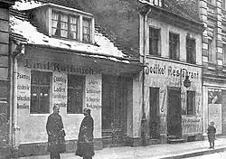 Commerçants juifs à Scheuenviertel en 1933 ; graffiti de l'étoile de David sur le mur à droite.