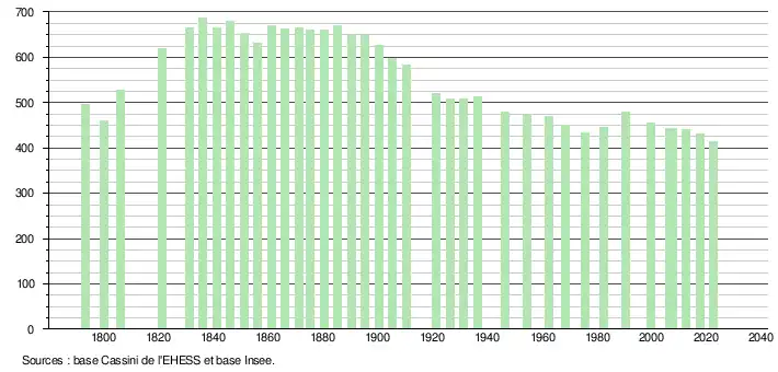 L'évolution du nombre d'habitants est connue à travers les recensements de la population effectués dans la commune depuis 1793. Pour les communes de moins de 10 000 habitants, une enquête de recensement portant sur toute la population est réalisée tous les cinq ans, les populations de référence des années intermédiaires étant quant à elles estimées par interpolation ou extrapolation[25]. Pour la commune, le premier recensement exhaustif entrant dans le cadre du nouveau dispositif a été réalisé en 2007[26].