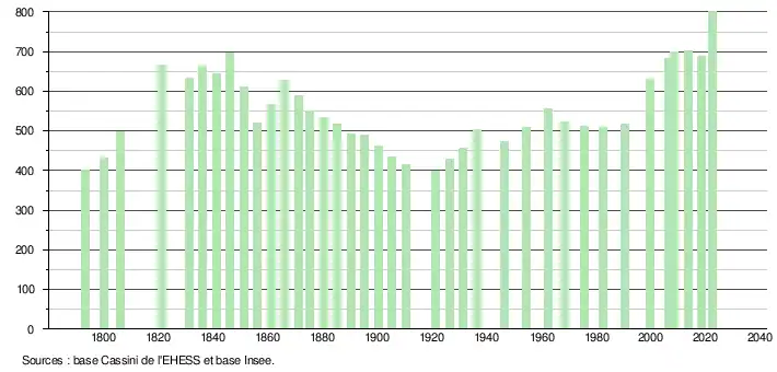L'évolution du nombre d'habitants est connue à travers les recensements de la population effectués dans la commune depuis 1793. Pour les communes de moins de 10 000 habitants, une enquête de recensement portant sur toute la population est réalisée tous les cinq ans, les populations de référence des années intermédiaires étant quant à elles estimées par interpolation ou extrapolation[18]. Pour la commune, le premier recensement exhaustif entrant dans le cadre du nouveau dispositif a été réalisé en 2008[19].