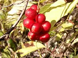 Les fruits sont des drupes[N 2] rouges de 5 à 6 mm de diamètre apparaissant en grappes[4].