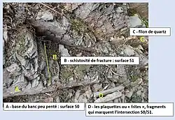 - ↑ la schistosité de crénulation (plis en chevron) déforme un élément structural préexistant (souvent une foliation de micas)