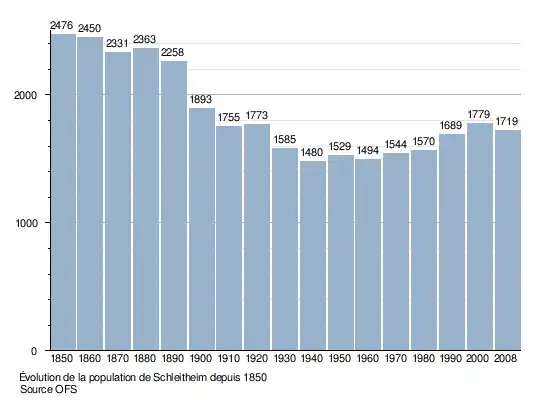 Le graphique suivant résume l'évolution de la population de Schleitheim entre 1850 et 2008[3] :