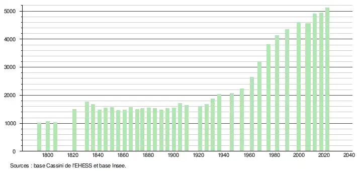 L'évolution du nombre d'habitants est connue à travers les recensements de la population effectués dans la commune depuis 1793. Pour les communes de moins de 10 000 habitants, une enquête de recensement portant sur toute la population est réalisée tous les cinq ans, les populations de référence des années intermédiaires étant quant à elles estimées par interpolation ou extrapolation[27]. Pour la commune, le premier recensement exhaustif entrant dans le cadre du nouveau dispositif a été réalisé en 2007[28].