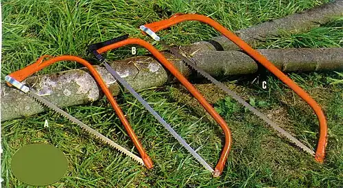 La scie à archet est une forme moderne de scie à cadre ; une forme plus ancienne de la scie à bûches comportait un cadre formé de trois longerons en bois, joints en forme de H. La structure était maintenue par un câble tensionneur à l'opposé de la lame (bucksaw en anglais).
