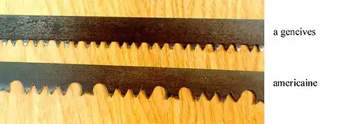 Pour du bois vert, les dents seront assez larges pour ménager entre elles un espace où vient se loger la sciure jusqu'à ce qu’elle tombe du trait de scie. Les dentures peuvent être à gencives, américaine ou suédoise.