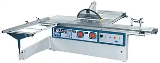 La scie à format est une scie composée d'un groupe de sciage fixe. C'est l'opérateur qui pousse la pièce à scier à l'aide de la table mobile (ou chariot).