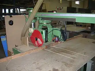 Une scie radiale est une machine-outil constituée d'une lame de scie circulaire mobile montée sur un support d'angle réglable. Elle est manipulable au moyen d'une poignée et elle permet d'effectuer des coupes transversales droites ou d'onglet. C'est l'outil qui vient à la rencontre de la pièce usinée.