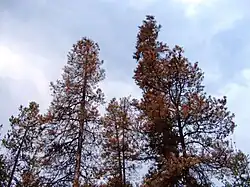 1re phase : des arbres malades, morts ou gravement stressés par la déshydratation (ici des Pinus contorta) sont attaqués par des défoliateurs, puis par des scolytes.