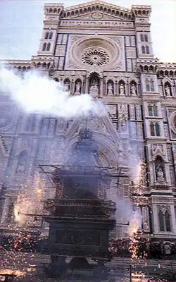 À la fin du Trecento, des feux d'artifice se sont substitués au trépied pour l'« explosion du chariot ».