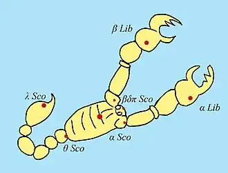 L’étoile la plus brillante de la constellation est Antarès (α Scorpii dans la désignation de Bayer), ainsi nommée (« comme Arès ou Mars ») en raison de sa couleur rouge similaire à celle de la planète Mars[13].