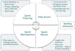 - ↑ alors qu'il n'y a pas de phases dans le framework Scrum actuel. Il y en avait trois dans la version initiale de 1995.