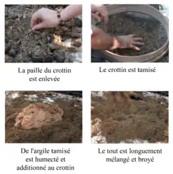 Après séchage, plusieurs couches composées d'un mélange d'argile et de crottes d'âne séchées, appelés banko, viennent recouvrir la première. L'ensemble est ensuite renforcé à l'aide de tiges métalliques et de fil de fer lorsque la pièce est de grande dimension.