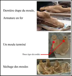 Les moules sont alors disposés bien droit dans du sable (on les sort du feu qui les a cuits). Bien calés entre eux, on y verse le bronze liquide soit à l'aide d'une louche en fer, soit directement en versant le creuset dans l'orifice.