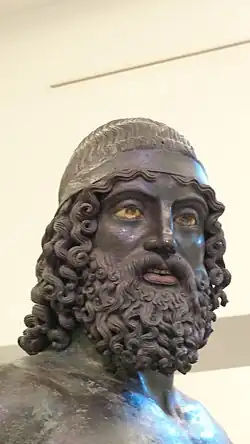 L'usage de patines volontaires dans la Grèce antique est encore très problématique pour les historiens de l'art : la plupart du temps, les statues de bronze ne reçoivent pas de patine chimique[2]. Cependant, les sculpteurs grecs utilisent plusieurs autres matériaux métalliques, notamment pour donner de la polychromie à leurs statues par des incrustations. Ainsi les lèvres et les mamelons sont-ils le plus souvent dans un alliage très riche en cuivre, donc très rouge[3]. Jusqu'au milieu du Ve siècle, les sourcils, le sang et les pointes des seins des hommes nus sont incrustés dans ce même matériau. Il arrive également que les dents soient plaquées d'argent, comme dans le cas de l'Aurige de Delphes et le guerrier A des Bronzes de Riace ; un doigt provenant de l'Acropole d'Athènes atteste la véracité du récit de Pausanias quand il parle d'ongles en argent. Quant aux yeux, il arrive qu'ils soient l'œuvre d'un artisan spécial, comme l'attestent les sources pour la période romaine (l'artisan est appelé oculus faber). Le globe oculaire, en marbre, ivoire, calcaire ou pâte de verre blanche est évidé pour y glisser l'iris en pâte de verre, quartz ou cristal de roche, qui comporte lui-même une cupule où placer la pupille, dans un verre de couleur différente ou en obsidienne. Le tout peut être maintenu par des arceaux métalliques. Les incrustations de l'iris et de la pupille n'emplissent pas entièrement la cavité qui leur est destinée, afin que la lumière puisse jouer avec. Des nuances très fines peuvent être obtenues, comme dans le cas d'une tête d'enfant hellénistique provenant d'Olympie dont l'iris est dans une pâte de verre brune avec des reflets violacés.