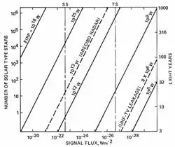 - La sensibilité de l'instrument doit permettre de détecter le signal malgré l'éloignement de la source. Les instruments actuels effectuent leurs observations sur des sources éloignées au maximum de 1000 à 2000 années-lumière alors que notre Galaxie a un diamètre de 100 000 années-lumière. Le projet le plus récent Breakthrough Listen n'est capable d'observer qu'un million d'étoiles alors que la Galaxie en compte 200 à 400 milliards.