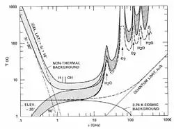 - Les radiotélescopes étudient plus particulièrement les longueurs d'onde correspondant à la raie d'émission de l'hydrogène (l'atome le plus abondant de l'Univers à 1420 MHz) et celle associée à la raie d'émission de la molécule d'eau (10 000 MHz). Entre ces deux fréquences (situées dans le spectre des micro-ondes), se trouve une fenêtre d'observation dans le spectre électromagnétique, baptisée point d'eau, particulièrement peu touchée par le bruit de fond galactique et les autres phénomènes perturbateurs. Les auteurs de l'article émettent l'hypothèse que le spectre situé entre ces deux fréquences serait probablement également utilisé de manière privilégiée par des civilisations extraterrestres[4].