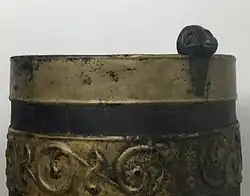 Une seule anse est conservée sur le seau. Elle est maintenue par deux attaches en bronze qui l'accrochent à la paroi. Elle représente une tête d'animal (sanglier[3]?) stylisée en bronze. À l'origine, elles étaient au nombre de deux, de part et d'autre du seau.