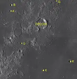 Par convention, les cratères satellites sont identifiés sur les cartes lunaires en plaçant la lettre sur le côté du point central du cratère qui est le plus proche de Secchi.
