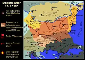 Conformément aux dispositions prises par leur père Ivan Aleksandre Asen, le royaume est partagé entre ses fils, Ivan Sratsimir héritant du petit tsarat de Vidin, et Ivan Chichman de celui de Tarnovo. Après la chute de la dynastie des Terter, en 1323, le boyard bulgare Balko (1323-1366), issu de cette dynastie, s'était progressivement approprié le pouvoir en Dobrogée. Il fonde le despotat de Dobrogée (en bulgare Dobroudja, en roumain Dobrogea). Son frère Dobrotitsa (1366-1386) se comporte comme un égal des tsars de Bulgarie et Ivan Aleksandre Asen le reconnaît comme souverain de la Dobrogée. Ivanko (1386-1390), fils et successeur de Dobrotitsa, sont confrontés aux coups de l'Empire ottoman qui s'empare du sud de leur pays en 1394, tandis que le joupan Démétrios constitue une principauté de Vicina au nord, vassale, puis partie (1401) de la principauté de Valachie, qui contrôlait déjà le nord des bouches du Danube (bras de Chilia) depuis 1328. Pour finir, l'Empire ottoman conquiert l'ensemble de la Dobrogée en 1421-1428[23]. Ainsi, le Royaume des Bulgares et des Valaques finit fragmenté en plusieurs petits États en 1371, certains à majorité bulgare (tzarats de Vidin et de Tarnovo), d'autres à majorité valaque (voïvodats de Valachie), d'autres multiethniques (despotats de Macédoine, de Grèce septentrionale et de Dobrogée). Trop faibles pour opposer une résistance réelle, ces petits États tombent l'un après l'autre sous la domination de l'Empire ottoman à la fin du XIVe siècle.