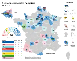 Dominé par la droite depuis 2014, le Sénat le reste après les élections sénatoriales de 2023 qui voient un nouveau recul de la majorité présidentielle qui perd quelques sièges[110]. Ces élections voient notamment la défaite de Sonia Backès, secrétaire d'État chargée de la Citoyenneté, candidate en Nouvelle-Calédonie[111],[112],[113],[114],[115].