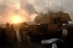 Un canon AS-90 britannique en action pendant l'invasion de l'Irak en 2003.