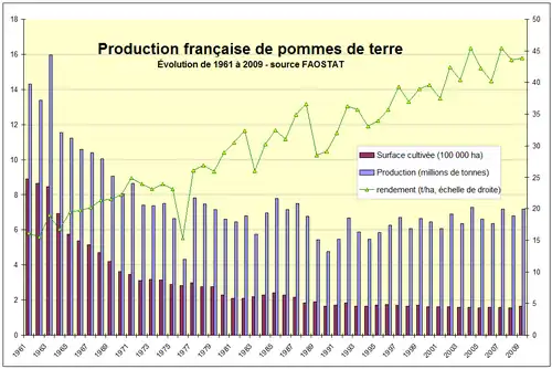La production française de pommes de terre a sensiblement diminué au cours des dernières décennies. Selon les statistiques publiées par la FAO, elle est passée de 14,3 millions de tonnes en 1961 à 7,16 Mt en 2009, diminuant pratiquement de moitié. En fait, après avoir connu son minimum historique à 4,33 Mt en 1976 (année de forte sècheresse en été au cours de laquelle le rendement moyen fut égal à 15,3 t/ha, revenant à son niveau de 1962), puis à 4,75 Mt en 1990 (deux années de sécheresse en 1990 et 1991 ont fait chuter le rendement moyen), elle s'est légèrement redressée et stabilisée depuis le début des années 1990. Dans le même temps la surface emblavée était divisée d'un facteur égal à 5,4, passant de 890 000 à 164 000 hectares, tandis que le rendement moyen était multiplié par 2,7, passant de 16,1 à 43,8 tonnes par hectare[13].