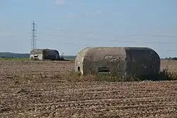 - ↑ Le niveau de protection d'une casemate de la ligne Maginot dépend de son modèle et de sa période de construction. De 1928 à 1935 sont construits les modèles les plus puissamment protégés : les casemates et ouvrages CORF (Commission d'organisation des régions fortifiées), avec des murs et dalles épais jusqu'à 3,5 mètres de béton). Puis viennent à partir de 1935 les blockhaus MOM (main-d'œuvre militaire), avec de 0,60 à 1,5 m de béton, avec des modèles très variés selon la région : RFM (région fortifiée de Metz), RFL (région fortifiée de la Lauter), 1re, 2e, 20e et 7e RM (région militaire). Les MOM les plus protégés sont appelés FCR (fortification de campagne renforcée). De 1937 à 1940, la STG (Section technique du génie) standardise les constructions, avec une protection de 1,50 à 2 m de béton.