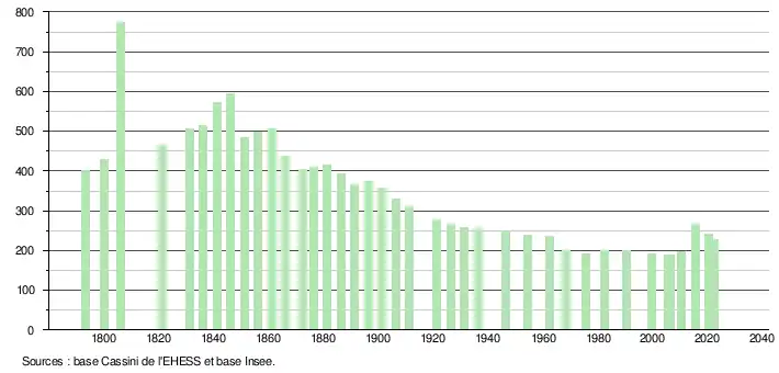 L'évolution du nombre d'habitants est connue à travers les recensements de la population effectués dans la commune depuis 1793. Pour les communes de moins de 10 000 habitants, une enquête de recensement portant sur toute la population est réalisée tous les cinq ans, les populations de référence des années intermédiaires étant quant à elles estimées par interpolation ou extrapolation[42]. Pour la commune, le premier recensement exhaustif entrant dans le cadre du nouveau dispositif a été réalisé en 2005[43].