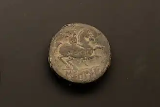- sur le revers, un cavalier armé d'une lance avec en dessous la légende ;