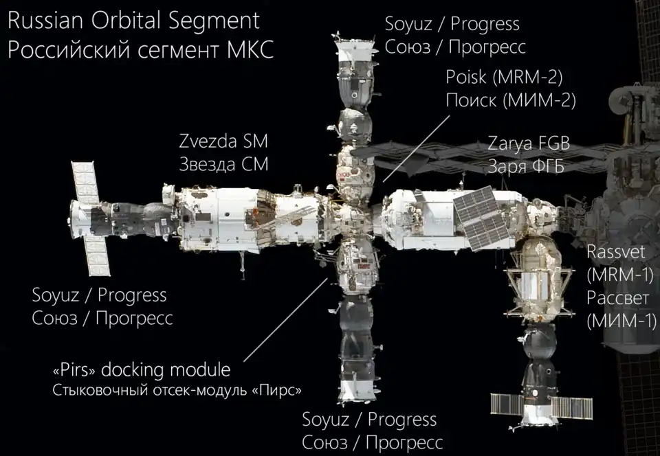 Le segment russe se compose actuellement de six modules pressurisés (Zarya, Zvezda, Poisk, Rassvet, Nauka et Pritchal) qui, ensemble, comprennent essentiellement la configuration de base de la station spatiale russe annulée Mir-2[1]. Le segment est contrôlé directement par le Centre de contrôle des vols spatiaux TsUP de Roskosmos à Korolev, près de Moscou.