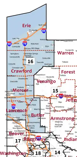 Le 16e district congressionnel de Pennsylvanie est situé dans le nord-ouest de la Pennsylvanie. Il contient tout le comté d'Érié, le comté de Crawford, le comté de Mercer, le comté de Lawrence, le comté de Butler et des parties du comté de Venango. Le district est représenté par le Républicain Mike Kelly.