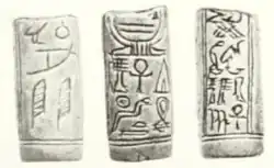 - un sceau-cylindre qui se trouve actuellement au Musée Petrie (UC 11527)[3],