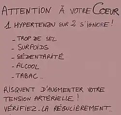 Les effets néfastes de l'excès de sel sont connus depuis 1969[16]. Le sel, ou chlorure de sodium, agit sur la tension artérielle en l'augmentant[18]. Le sel n'est pas l'unique facteur, mais il augmente les risques, favorisant également la rétention d'eau[16]. L'élévation de la pression artérielle augmente le risque d'accident cardiovasculaire, dont principalement l'infarctus. L'abus de sel est donc particulièrement déconseillé aux personnes souffrant d'hypertension artérielle, mais aussi, aux autres personnes. Au contraire, la réduction de l'apport sodé permet la diminution de la tension artérielle[19]. La diminution des apports sodés pourrait également, de manière indépendante de la baisse de la tension, diminuer le risque de maladie cardiovasculaire[20].