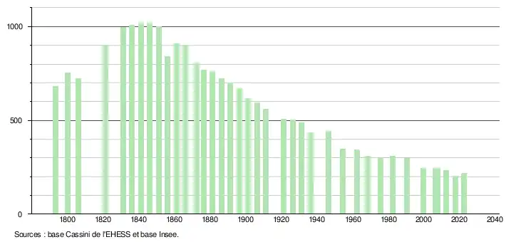 L'évolution du nombre d'habitants est connue à travers les recensements de la population effectués dans la commune depuis 1793. Pour les communes de moins de 10 000 habitants, une enquête de recensement portant sur toute la population est réalisée tous les cinq ans, les populations de référence des années intermédiaires étant quant à elles estimées par interpolation ou extrapolation[25]. Pour la commune, le premier recensement exhaustif entrant dans le cadre du nouveau dispositif a été réalisé en 2007[26].