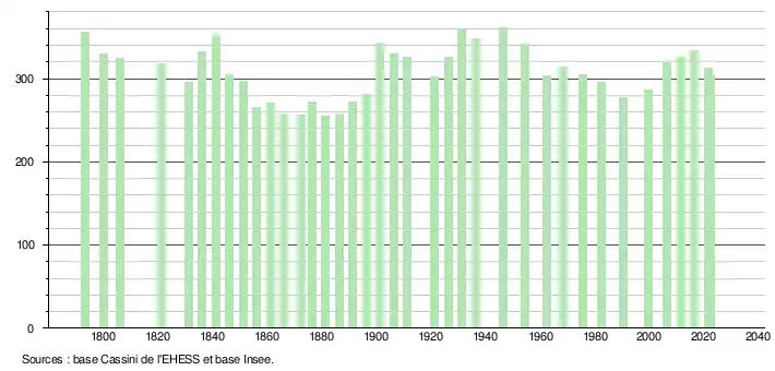 L'évolution du nombre d'habitants est connue à travers les recensements de la population effectués dans la commune depuis 1793. Pour les communes de moins de 10 000 habitants, une enquête de recensement portant sur toute la population est réalisée tous les cinq ans, les populations de référence des années intermédiaires étant quant à elles estimées par interpolation ou extrapolation[31]. Pour la commune, le premier recensement exhaustif entrant dans le cadre du nouveau dispositif a été réalisé en 2006[32].