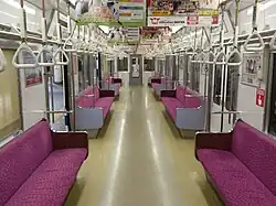 L'organisation des places assises est en longitudinal, ce qui est habituel au Japon pour les lignes de banlieue. Des emplacements porte- bagages sont présents au-dessus des sièges.