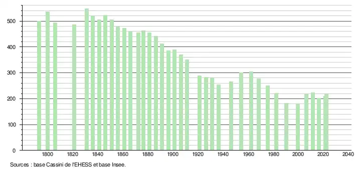L'évolution du nombre d'habitants est connue à travers les recensements de la population effectués dans la commune depuis 1793. Pour les communes de moins de 10 000 habitants, une enquête de recensement portant sur toute la population est réalisée tous les cinq ans, les populations de référence des années intermédiaires étant quant à elles estimées par interpolation ou extrapolation[18]. Pour la commune, le premier recensement exhaustif entrant dans le cadre du nouveau dispositif a été réalisé en 2006[19].