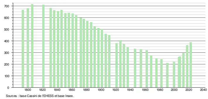L'évolution du nombre d'habitants est connue à travers les recensements de la population effectués dans la commune depuis 1793. Pour les communes de moins de 10 000 habitants, une enquête de recensement portant sur toute la population est réalisée tous les cinq ans, les populations de référence des années intermédiaires étant quant à elles estimées par interpolation ou extrapolation[17]. Pour la commune, le premier recensement exhaustif entrant dans le cadre du nouveau dispositif a été réalisé en 2007[18].