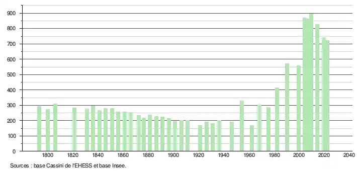 L'évolution du nombre d'habitants est connue à travers les recensements de la population effectués dans la commune depuis 1793. Pour les communes de moins de 10 000 habitants, une enquête de recensement portant sur toute la population est réalisée tous les cinq ans, les populations de référence des années intermédiaires étant quant à elles estimées par interpolation ou extrapolation[15]. Pour la commune, le premier recensement exhaustif entrant dans le cadre du nouveau dispositif a été réalisé en 2004[16].