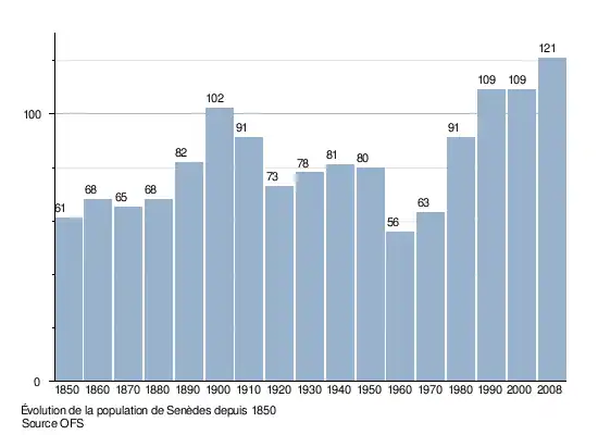 Selon l'Office fédéral de la statistique, Senèdes compte 150 habitants en 2023[4]. Sa densité de population atteint 300 hab./km2.