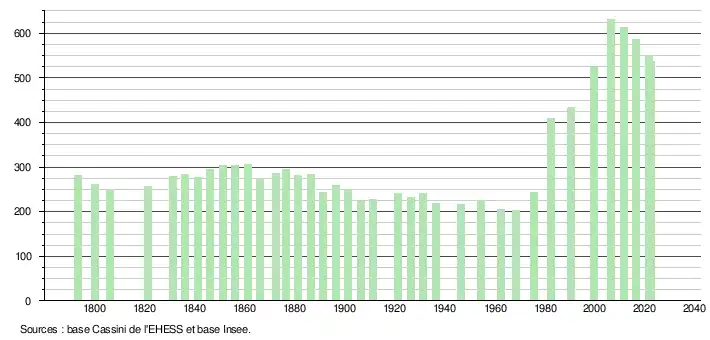 L'évolution du nombre d'habitants est connue à travers les recensements de la population effectués dans la commune depuis 1793. Pour les communes de moins de 10 000 habitants, une enquête de recensement portant sur toute la population est réalisée tous les cinq ans, les populations de référence des années intermédiaires étant quant à elles estimées par interpolation ou extrapolation[19]. Pour la commune, le premier recensement exhaustif entrant dans le cadre du nouveau dispositif a été réalisé en 2006[20].