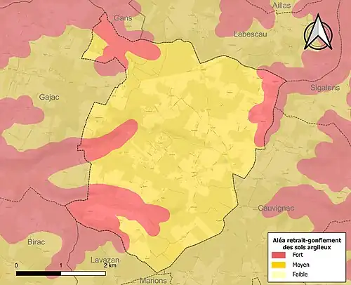 Le retrait-gonflement des sols argileux est susceptible d'engendrer des dommages importants aux bâtiments en cas d’alternance de périodes de sécheresse et de pluie. La totalité de la commune est en aléa moyen ou fort (67,4 % au niveau départemental et 48,5 % au niveau national). Sur les 157 bâtiments dénombrés sur la commune en 2019, 157 sont en aléa moyen ou fort, soit 100 %, à comparer aux 84 % au niveau départemental et 54 % au niveau national. Une cartographie de l'exposition du territoire national au retrait gonflement des sols argileux est disponible sur le site du BRGM[20],[Carte 2].