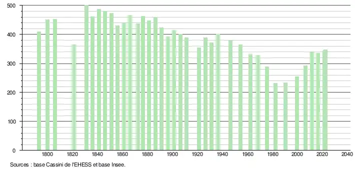 L'évolution du nombre d'habitants est connue à travers les recensements de la population effectués dans la commune depuis 1793. Pour les communes de moins de 10 000 habitants, une enquête de recensement portant sur toute la population est réalisée tous les cinq ans, les populations de référence des années intermédiaires étant quant à elles estimées par interpolation ou extrapolation[22]. Pour la commune, le premier recensement exhaustif entrant dans le cadre du nouveau dispositif a été réalisé en 2006[23].