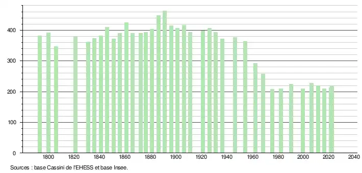 L'évolution du nombre d'habitants est connue à travers les recensements de la population effectués dans la commune depuis 1793. Pour les communes de moins de 10 000 habitants, une enquête de recensement portant sur toute la population est réalisée tous les cinq ans, les populations de référence des années intermédiaires étant quant à elles estimées par interpolation ou extrapolation[34]. Pour la commune, le premier recensement exhaustif entrant dans le cadre du nouveau dispositif a été réalisé en 2006[35].