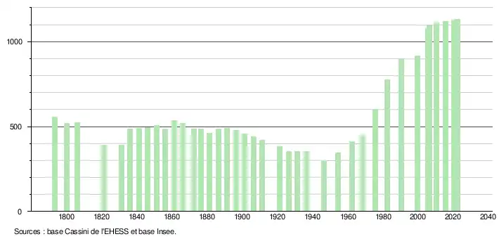 L'évolution du nombre d'habitants est connue à travers les recensements de la population effectués dans la commune depuis 1793. Pour les communes de moins de 10 000 habitants, une enquête de recensement portant sur toute la population est réalisée tous les cinq ans, les populations de référence des années intermédiaires étant quant à elles estimées par interpolation ou extrapolation[19]. Pour la commune, le premier recensement exhaustif entrant dans le cadre du nouveau dispositif a été réalisé en 2005[20].