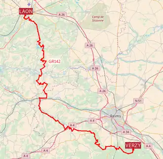 Le sentier de grande randonnée 142 (GR 142) part de Verzy dans la Marne en embranchement du GR 14 et aboutit provisoirement à Guise dans l'Aisne. Le sentier est décrit dans sa partie Fismes-Laon dans le topoguide GR de Picardie[1]. Le balisage a été effectué jusqu'à Guise.